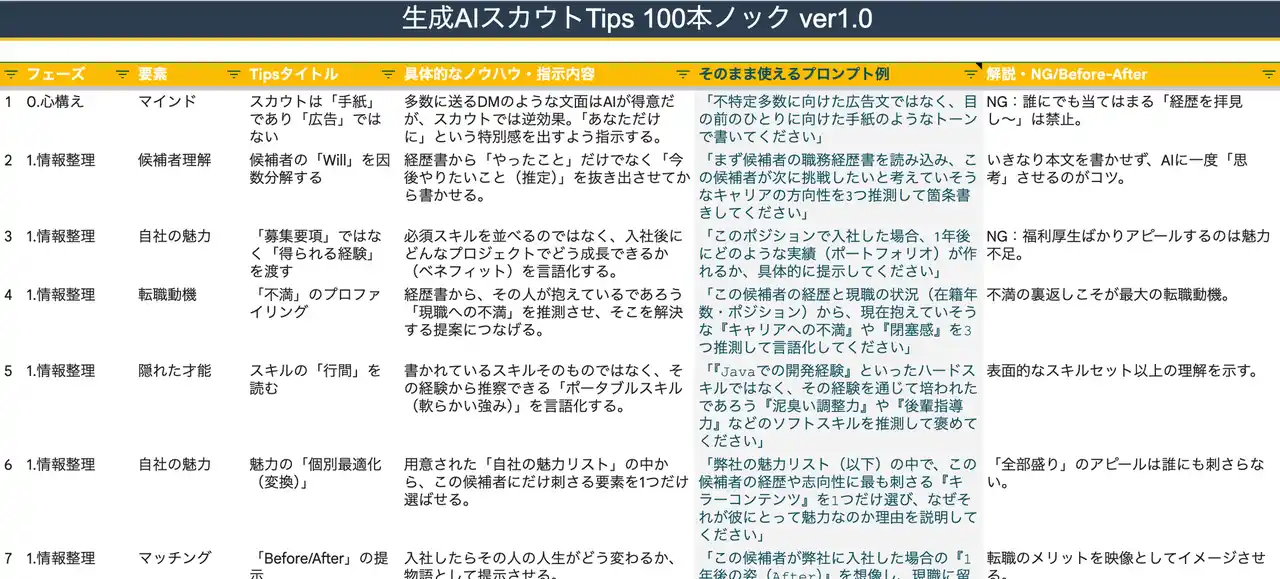 本資料は、AIスカウトの返信率を高めるための「理論・戦略マニュアル(PDF)」と、コピー&ペーストですぐに使える「実践プロンプト集(Excel)」がセットになっています。 |