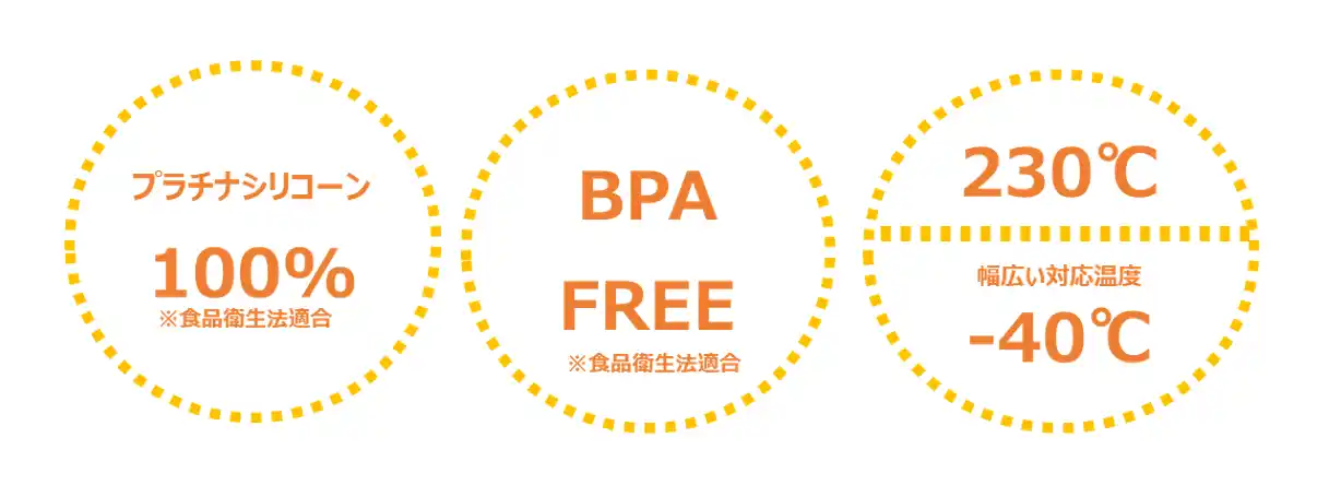 本製品は医療器具や乳幼児用の製品などにも使用されている100%プラチナシリコーン製※5です。また、化学物質BPA(ビスフェノールA)フリー※5の製品となっていますので、妊婦や乳幼児でも安心してご使用いただけます(食品衛生法適合)。プラチナシリコーンは、一般的なシリコーンゴムと比べ、耐熱・耐冷性に優れ、急激な温度変化に耐えることができます。柔軟性にも優れており、引き裂き強度が高く破けにくいため、くり返しの使用に適しています。 |