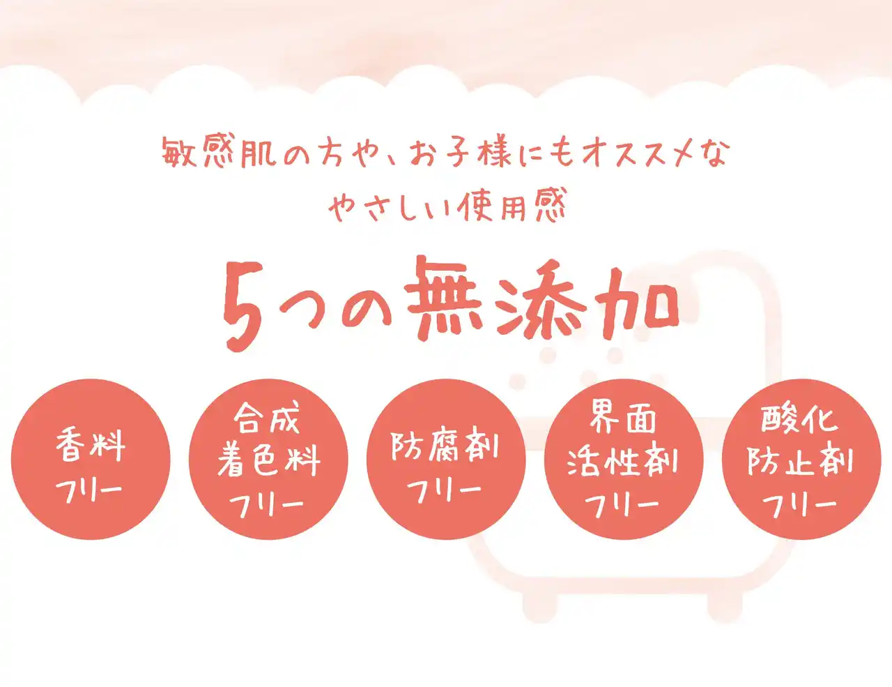 香料/合成着色料/防腐剤/界面活性剤/酸化防止剤を使用しない"5つの無添加処方*"で、やさしい使用感に配慮しました。 |