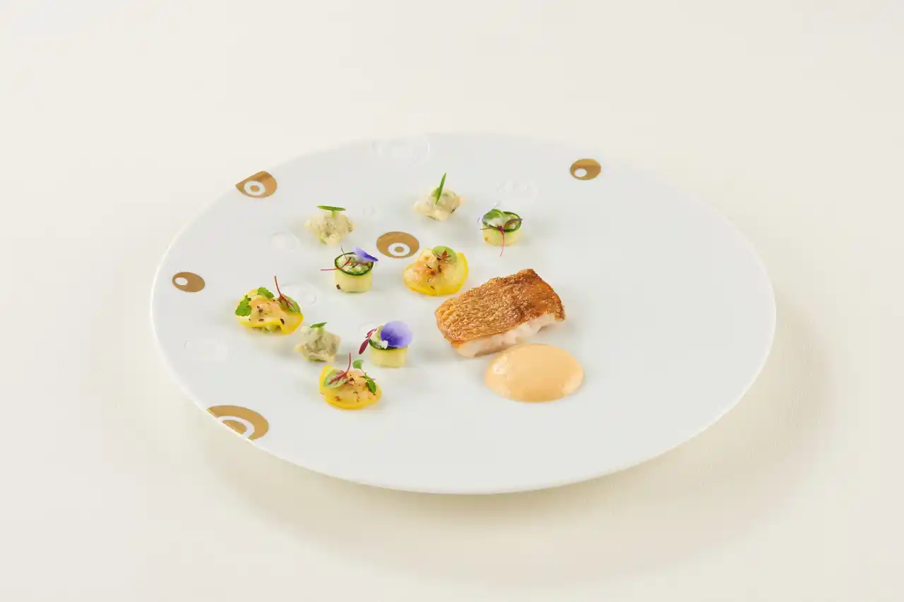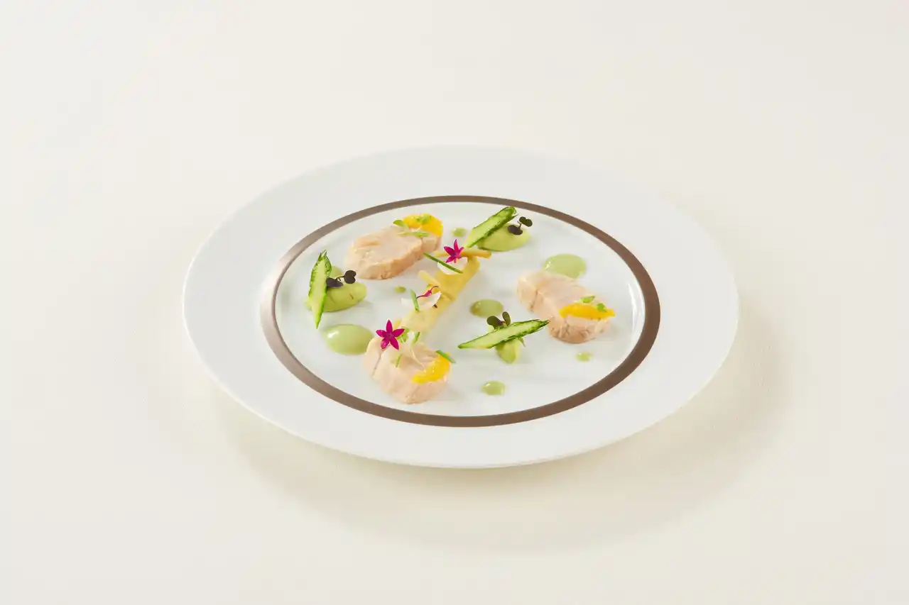| きめ細やかで上品な味わいのメバルに、芽吹きの季節を感じさせる彩り豊かな春野菜を添え、春のベルサイユ宮殿の庭園を想わせる一皿に仕立てました。繊細な旨みと瑞々しい野菜のハーモニーが、優雅で華やかな春の情景をテーブルに描き出します。 | |||||||||