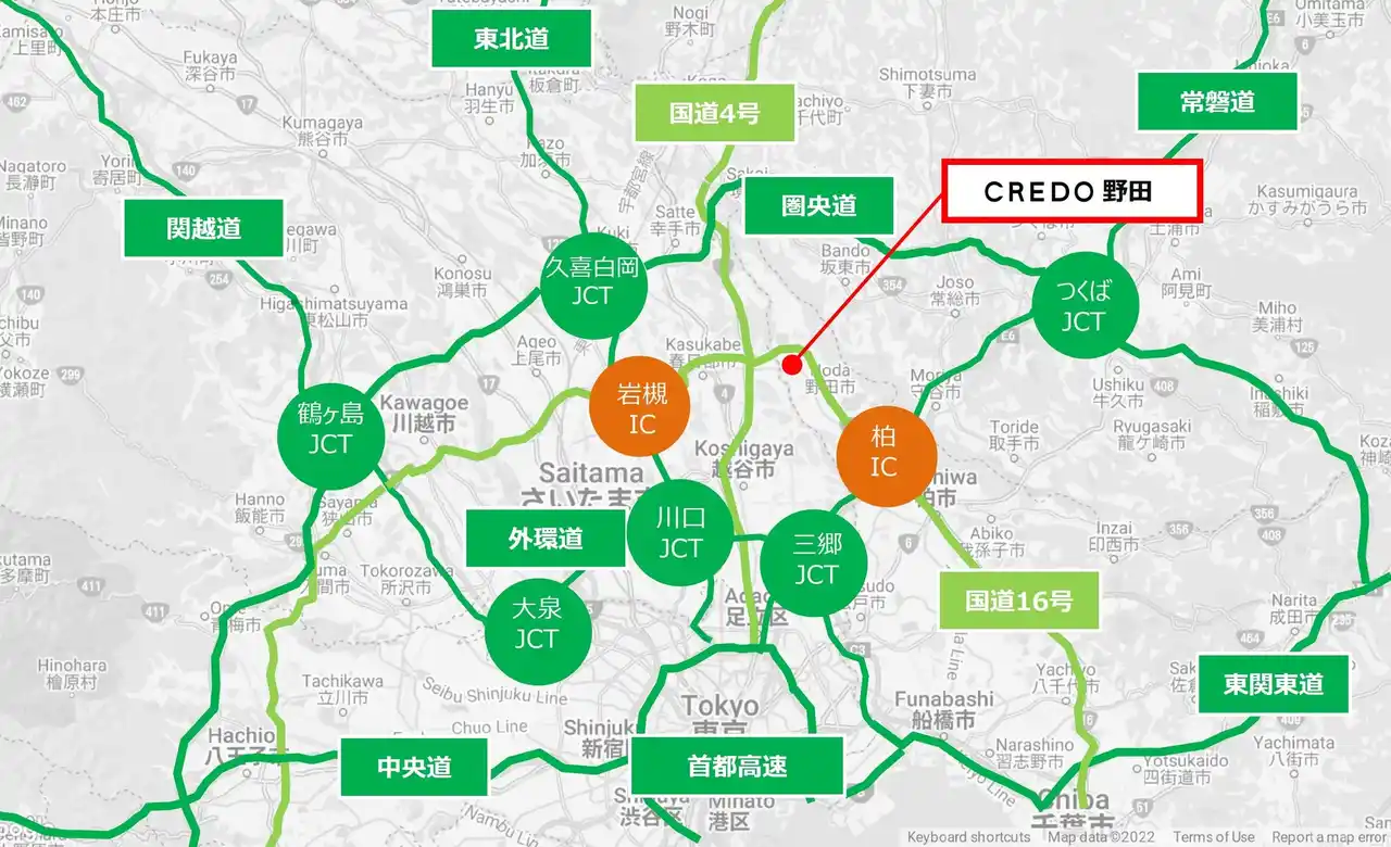| 「CREDO野田」は各階アクセスが可能なダブルランプウェイ式4階建の物流施設で、千葉県野田市の国道16号沿いに位置し、都心へのアクセスに優れています。さらに、交差点改良を行うことにより、柏・春日部の両方面からトラックの入出庫が可能な点が特徴です。常磐自動車道「柏IC」や東北自動車道「岩槻IC」へのアクセスが良好で、物流拠点として開発が進む柏・野田エリアの立地特性を活かし、東日本を広くカバーする広域配送拠点としても適しています。 | |||