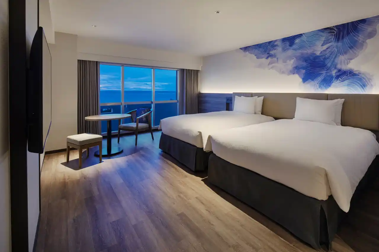 沖縄の海をイメージした、青がアクセントのスタイリッシュな客室 |