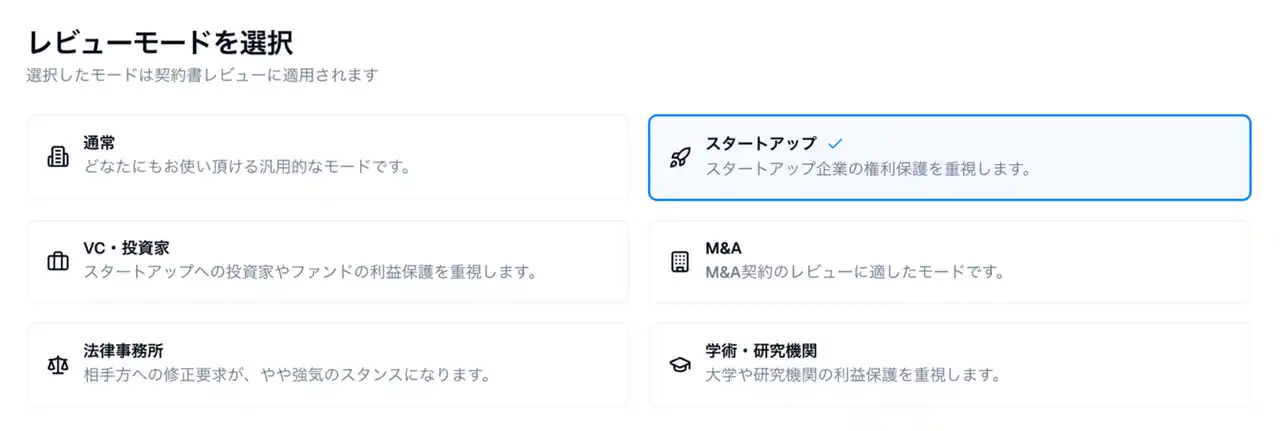 一般企業法務のための「通常モード」のほか、スタートアップ向けの「スタートアップモード」や、大学向けの「学術・研究機関モード」などを搭載しています。 |