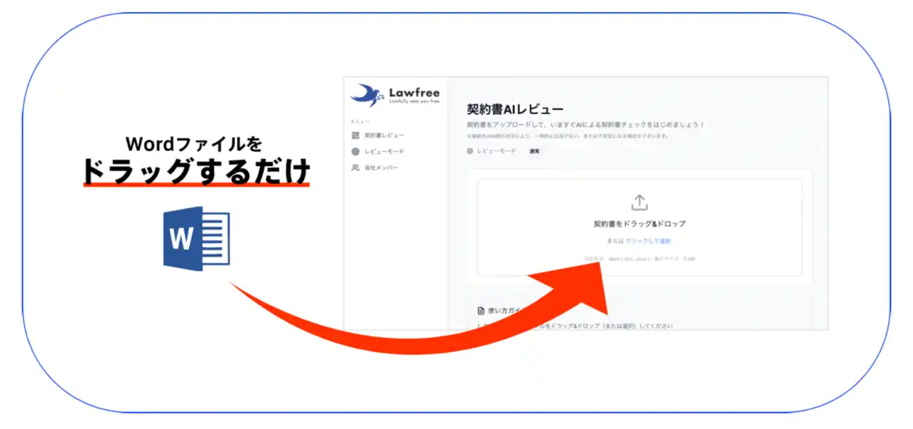 Lawfree(ローフリー)は、契約書ファイルをドラッグするだけの簡単操作で、AIが契約書のリスク検知から修正案提示までを数分で行います。 |