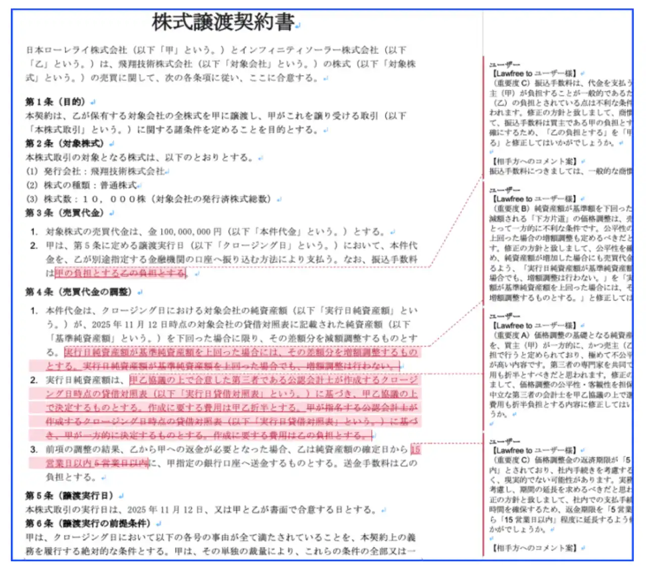 法務の実務でスタンダードな「変更履歴」と「コメント」で、1.条文の修正案、2.ユーザーへの解説、3.相手方へのコメント案、をAIが作成します。 |