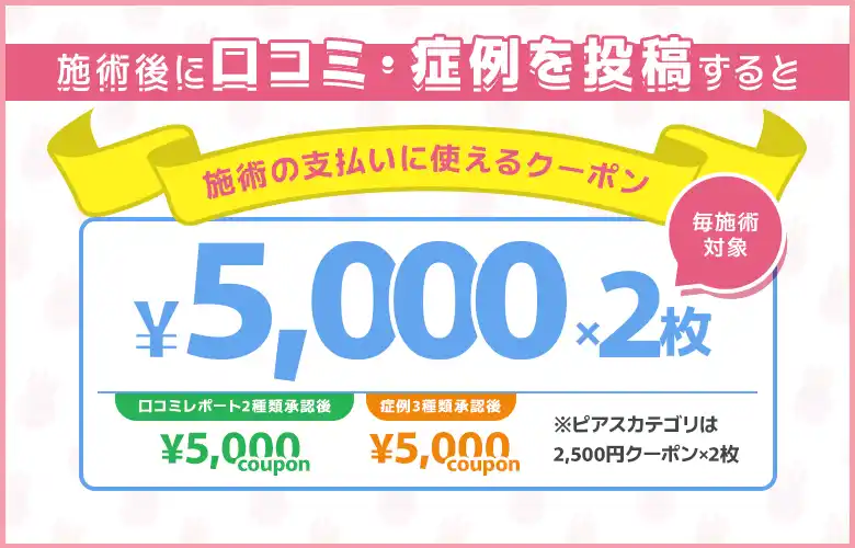 今回のアップデートで、還元ルールを完全刷新! 口コミ投稿で5,000円分、症例写真の投稿でさらに5,000円分。 |