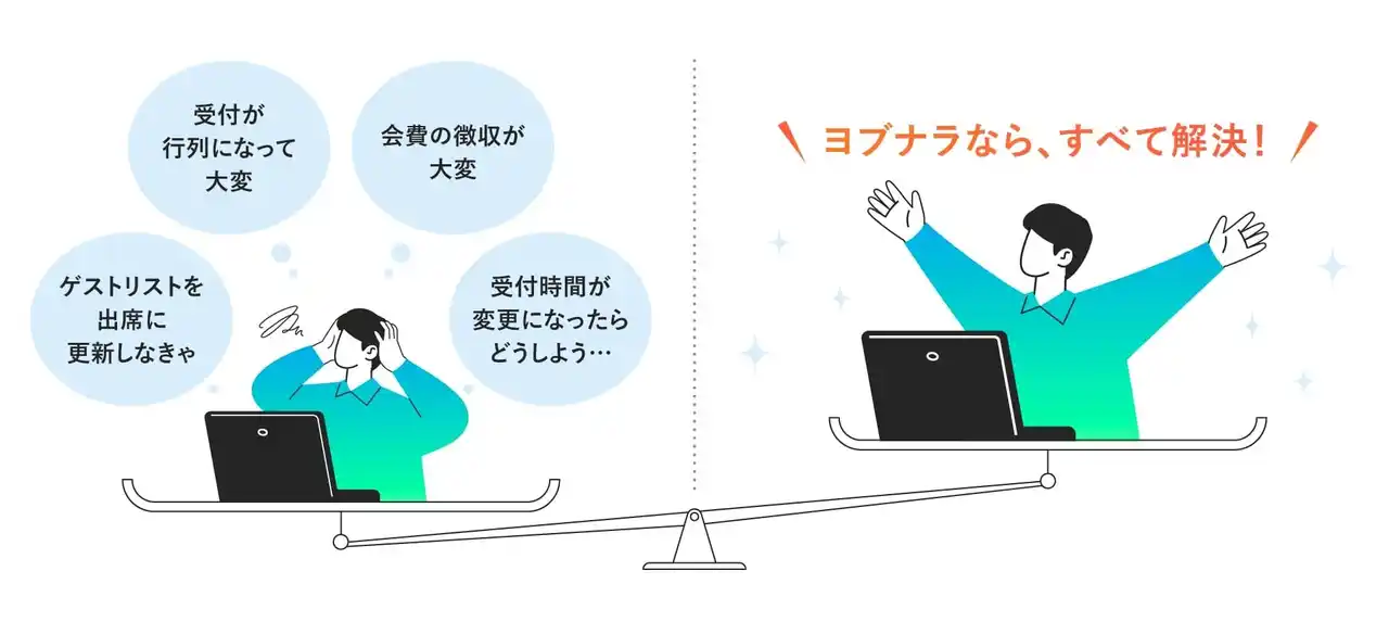 イベント主催者への案内後、サービス内容や利用方法に関する詳細な説明、導入後のお問い合わせ対応は、ヨブナラが担当します。 |