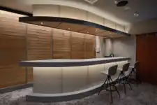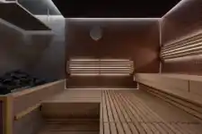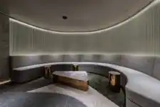 バーを併設するサウナ施設。ホテルライクな質感と先進的なデザインで、上質かつ非日常の空間に仕上げています。サウナはパブリック用とプライベート用の2種類それぞれ異なる特徴的なデザインとしました。整いスペースの間接照明は緩やかに明滅するゆらぐ演出を採用し、照明・動線・仕上げを総合的に設計し、没入感と回復感を両立しました。 |