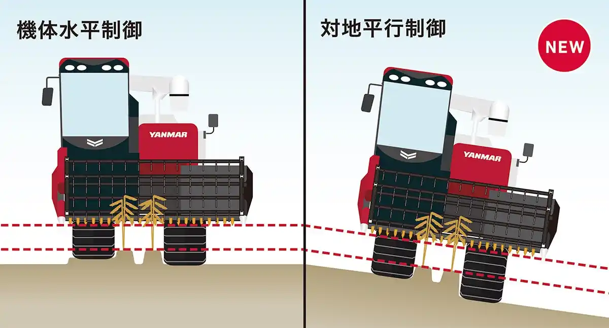 ほ場の起伏などを感知し、左右のクローラを上下させて水平を保つ「機体水平制御」に加え、大豆など高さの異なるうねや傾斜地でも刈取部をうねに対して平行に保つ「対地平行制御」を新たに採用しました。さらに、作物の刈高さを一定に制御できる「自動刈高さ制御」も装備することで、土の混入による汚粒の発生を抑え、きれいな収穫を実現します。 |