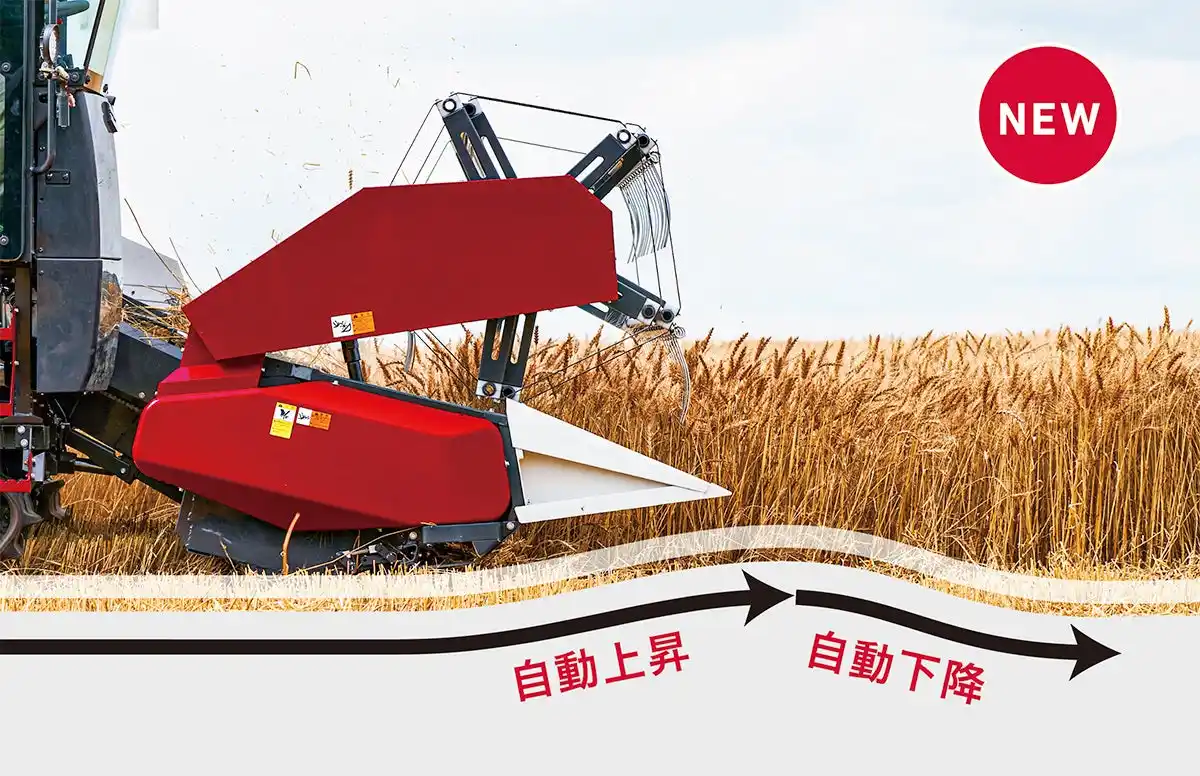 本機では、シンプル装備でありながら、他の型式で好評の対地平行制御や自動刈高さ制御、刈取オートリフトスイッチ・オートセットスイッチなどを新たに搭載することで、作業の安定性、効率性が大幅に向上しました。 |