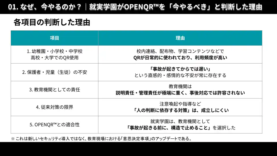 そのため就実小学校では、 注意喚起や指導の強化ではなく、 「事故が起きる前に、構造で止める」という判断のもと、 OPENQR(TM)の実運用を開始しました。 |