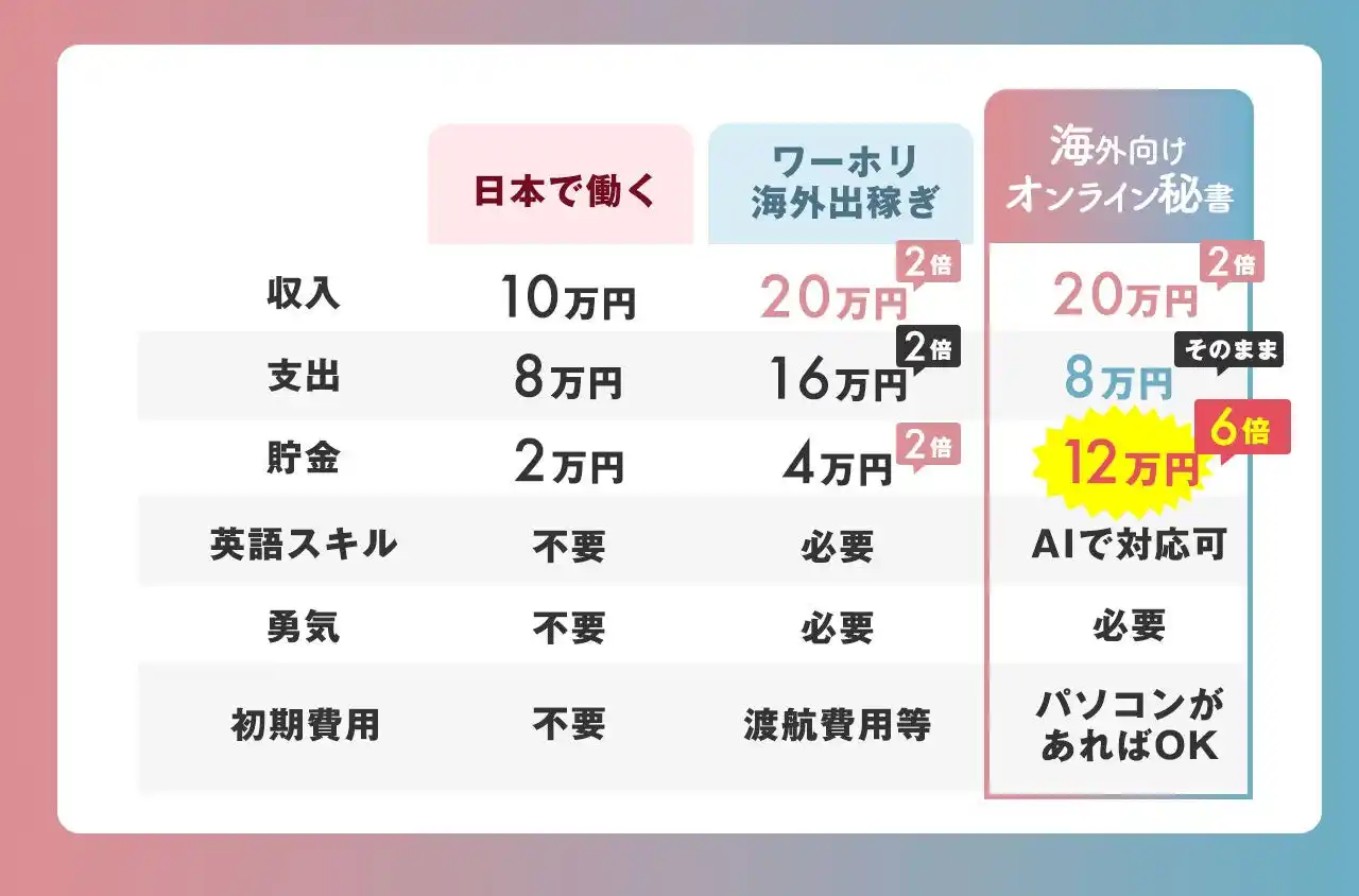 日本と欧米圏の「時差」は、在宅ワーカーにとって大きな武器になります。例えば、日本の深夜や早朝が海外のビジネスアワーに当たるため、育児に追われる主婦の方や本業がある会社員の方でも、家族が寝静まった後の1~2時間を活用して効率的に稼ぐことができます。場所に縛られないだけでなく、「時間」も有効活用しながら、資産価値の高いドル建ての報酬を積み上げることが可能です。 |
