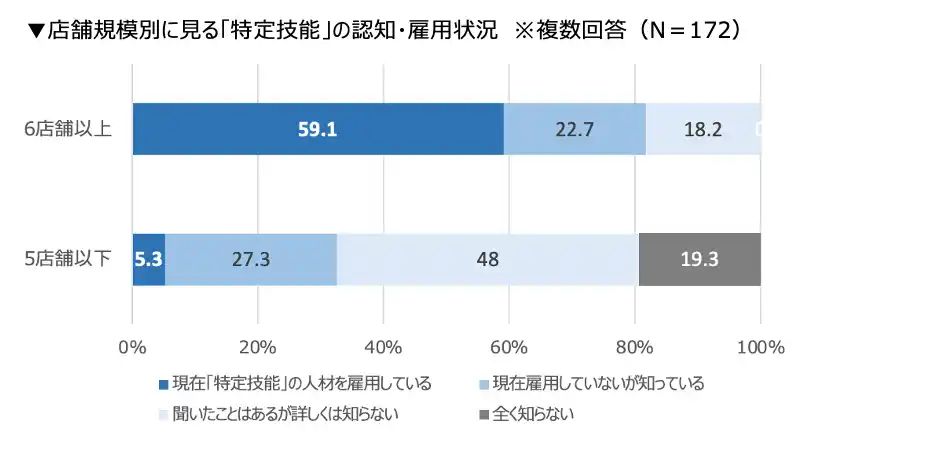 6店舗以上の事業者では、「現在『特定技能』の人材を雇用している」と回答した割合が59.1%に達しており、制度の理解・活用が進んでいる様子がうかがえます。一方、5店舗以下の事業者では、「聞いたことはあるが詳しくは知らない」「全く知らない」といった回答が67.3%を占めており、小規模事業者ほど制度理解が進んでいない実態が明らかになりました。 |