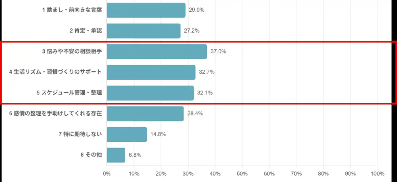 AIに期待する役割として、「相談相手」(37.0%)や「習慣づくりのサポート」(32.7%)が上位となりました。感情面への寄り添いを求める声も3割前後にのぼり、管理だけでなく“伴走的な支援”への期待が見られます。 |