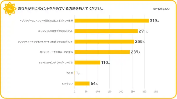 今回の調査では、「積極的にポイ活をしていると思わない」と答えた人を対象に調査を実施しました。積極的にポイ活をしていないノンアクティブ層でも「どのくらいの頻度でポイントを貯めますか」という質問に「週1回以上ポイントを貯める」と回答した人は941人(74.8%)にのぼりました(Q1)。ポイントを貯める方法としては「アプリやゲーム、アンケート回答などによるポイント獲得」と回答した人が最も多く319人(25.4%)で、次いで「キャッシュレス決済で貯まるポイント」と回答した人は271人(21.6%)ということが判明した(Q2)。 |