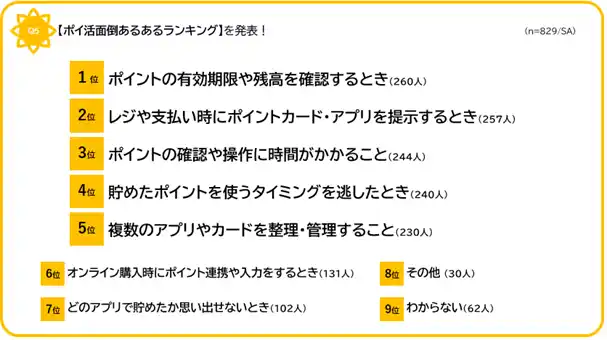 また、積極的にポイ活を行わないポイ活ノンアクティブ層の「ポイ活面倒あるある」をランキング化。第1位は「ポイントの有効期限や残高を確認するとき」が260人(31.4%)、第2位は「レジや支払い時にポイントカード/アプリを提示するとき」が257人(31.0%)、第3位は「ポイントの確認や操作に時間がかかること」が244人(29.4%)と日常生活でストレスが貯まっていることが判明(Q5)。 |