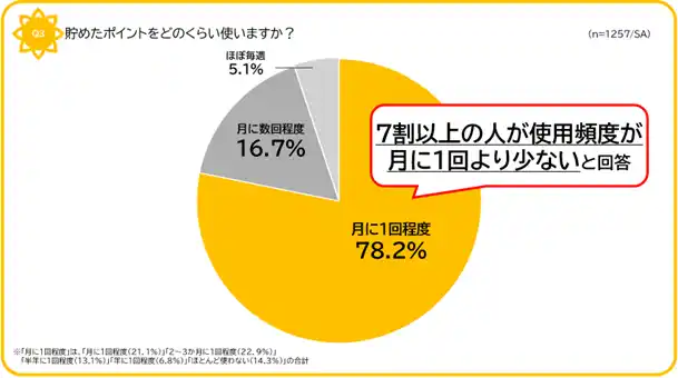 ・一方で貯めたポイントを使う頻度としては、「月1回よりも頻度が少ない」と回答した人が983人(78.2%)と約8割にのぼった。 |