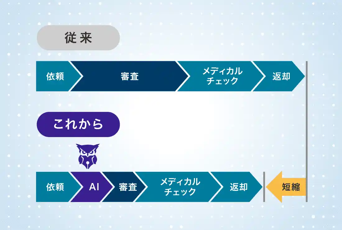 生成AIの活用によりレビュー作業を効率化し、審査完了まで時間を大幅に短縮します。 |