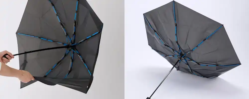 独自開発した青い骨は、最大4本を連結した構造になっており、強靭な強さと安定性を実現。全形態に耐風仕様の傘骨を採用し、風速30m/s※の試験もクリア。突然の強風時にも安心して使用できる強さを備えています。 |