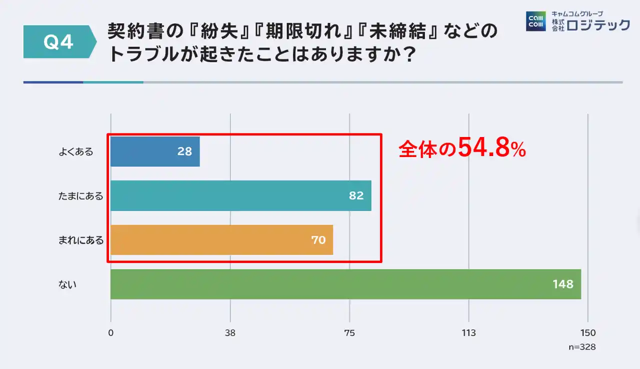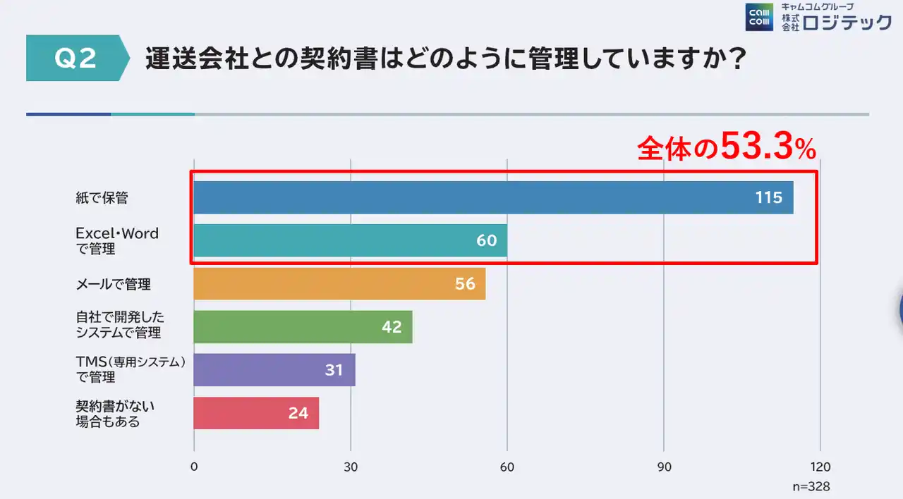 「働く」に関する社会課題をビジネスで解決するキャムコムグループの株式会社ロジテック(以下ロジテック、本社:東京都新宿区、代表取締役:縄田崇)は2025年8月から9月にかけ、荷主企業を対象に「物流業務における契約・取引管理の実態調査」を実施しました。その結果、契約管理の55%が紙やExcelによる運用に依存していることが明らかになりました。2024年に改正された物流関連二法(*1)により、契約条件の明確化や取引の適正化が求められる中、契約管理の属人化が業務トラブルや経営リスクにつながっている実態が浮き彫りとなっています。 |