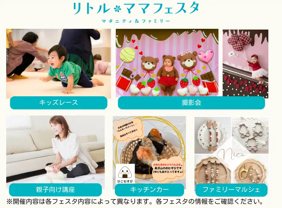 「リトル・ママフェスタ」は、『ママたちが集まる場所をつくる』という想いを原点に、これから出産を迎える方や、現在子育てをしている方はもちろん、子育てに関わるすべての人に向けた、「出会う」「学ぶ」「遊ぶ」がぎゅっと詰まった国内最大級の親子フェスタです。 北海道から沖縄まで全国の主要都市で開催されており、年間65回を超える開催数は、親子フェスタとして日本一の規模(自社調べ)。年間30万人以上のママ・パパが来場しています。キッズレースや撮影会、ステージ企画に加え、企業ブースでは気になる商品を実際に見て・試せる体験型コンテンツも充実。「こんなイベントが欲しかった!」と思える、親子で笑顔になれるひとときを過ごせる場として、多くの支持を集めています。 |