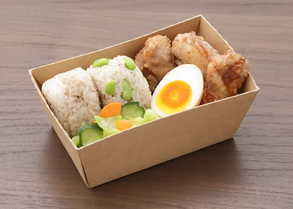 キッチンカーでも大人気!「浜のうまだし」を混ぜ込んだおむすびと、あごだしから揚げがセットになった、おすすめが詰まったお弁当です。 |