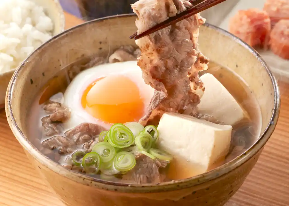 焼きあごだしの香りと旨みのある醤油ベースのつゆに、牛肉、豆腐、半熟卵が入ったボリュームある汁物おかず。博多の新たな名物になること間違いなし! |