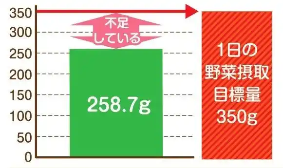 野菜摂取量の目標量は1日350g以上ですが、国民健康・栄養調査(令和6年)によると、野菜摂取量は平均(20歳以上)で258.7gと、100g程度足りていないという結果でした。 |