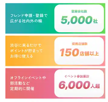 最大の特徴は「チェックイン」機能を起点に体験が広がる点で、渋谷エリアにチェックインするとポイントが貯まります。ポイントは渋谷エリアの飲食店や体験施設等で利用できます。また、チェックインを通じて「いま渋谷にいる人」同士でコミュニケーションがとりやすく、興味関心を起点とした交流のきっかけを創出し、仕事や趣味に関する情報交換にも活用できます。ユーザーを対象とした幅広いイベントを通じて実際に会えるなど、デジタルとリアルの両面からつながりとおトクを提供します。“コミュニティインフラ”として、街を支える存在をめざしています。 |
