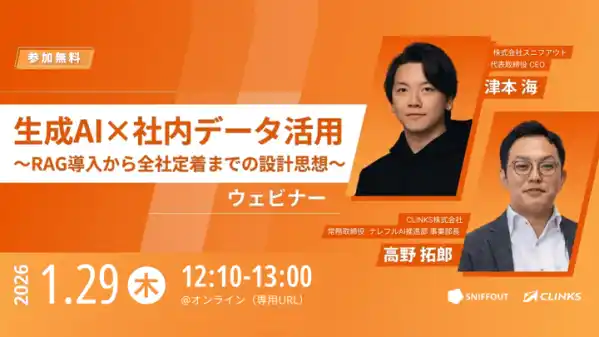 600社以上に導入されている生成AIチャット「ナレフルチャット」を提供するCLINKSと、 50社以上の生成AI・RAG導入を支援してきたスニフアウトが、 失敗しないための「生成AI×データ活用」を解説します。