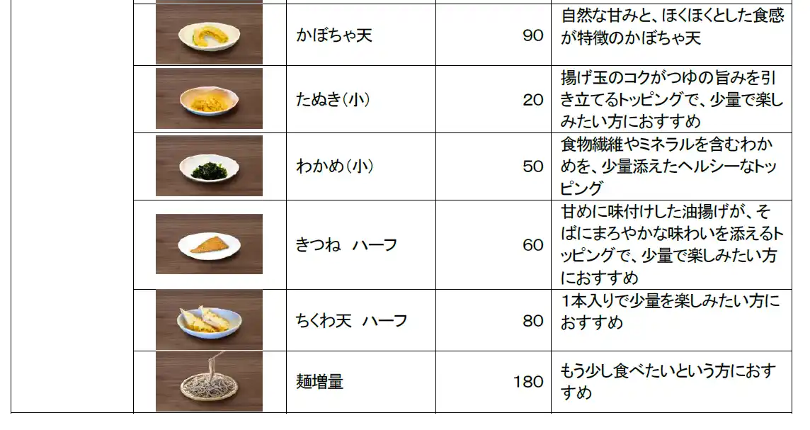 本日から、かけそば・もりそばや、ちくわ天、海老天を始めとするトッピングなど計14商品が |