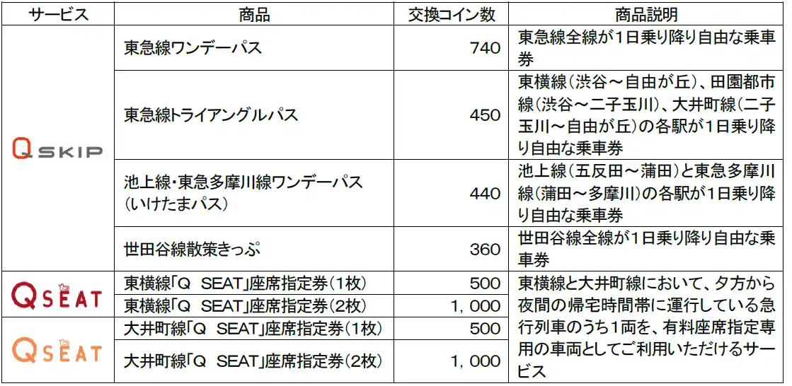 PASMOやSuica(モバイルPASMO、モバイルSuicaを含む)での東急線の乗車(定期券利用を除く)や、タッチ決済対応のクレジットカードであるTOKYU CARDでの東急線の後払い乗車、東急線PASMO定期券の購入、TOKYUCARDでの「Q SKIP」商品や「Q |