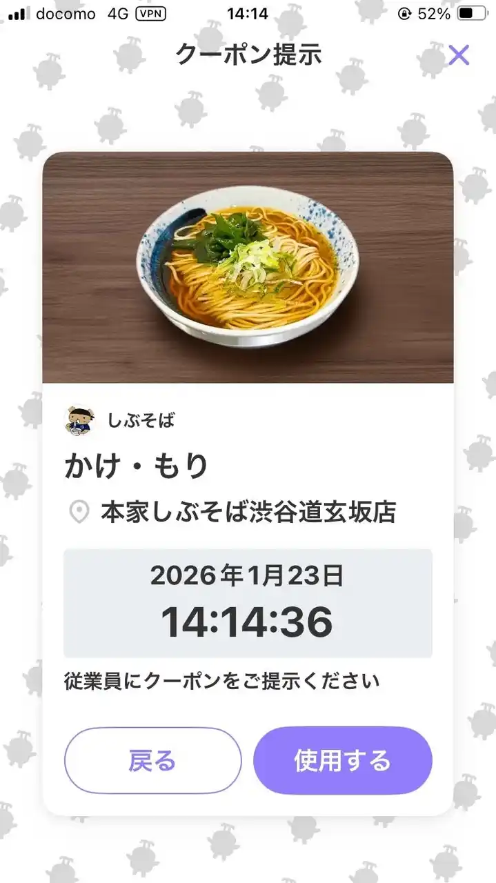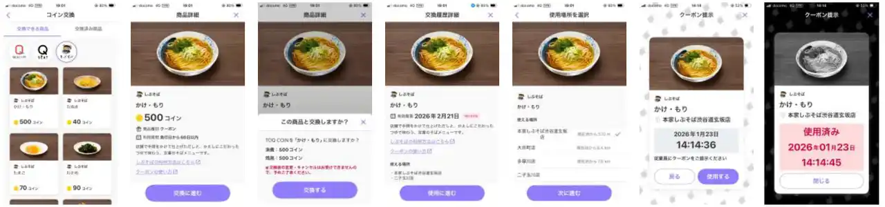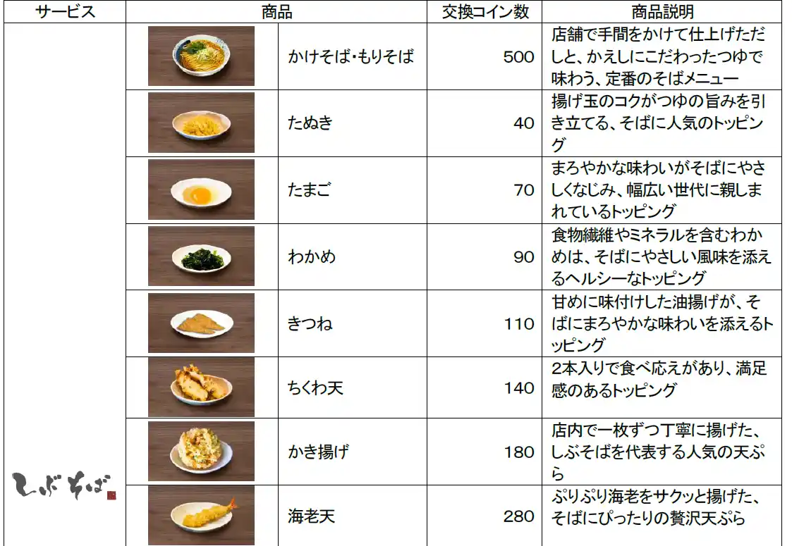 ・「しぶそば」全店で「TOQ COIN」で貯めたコインを商品に交換できます。 |