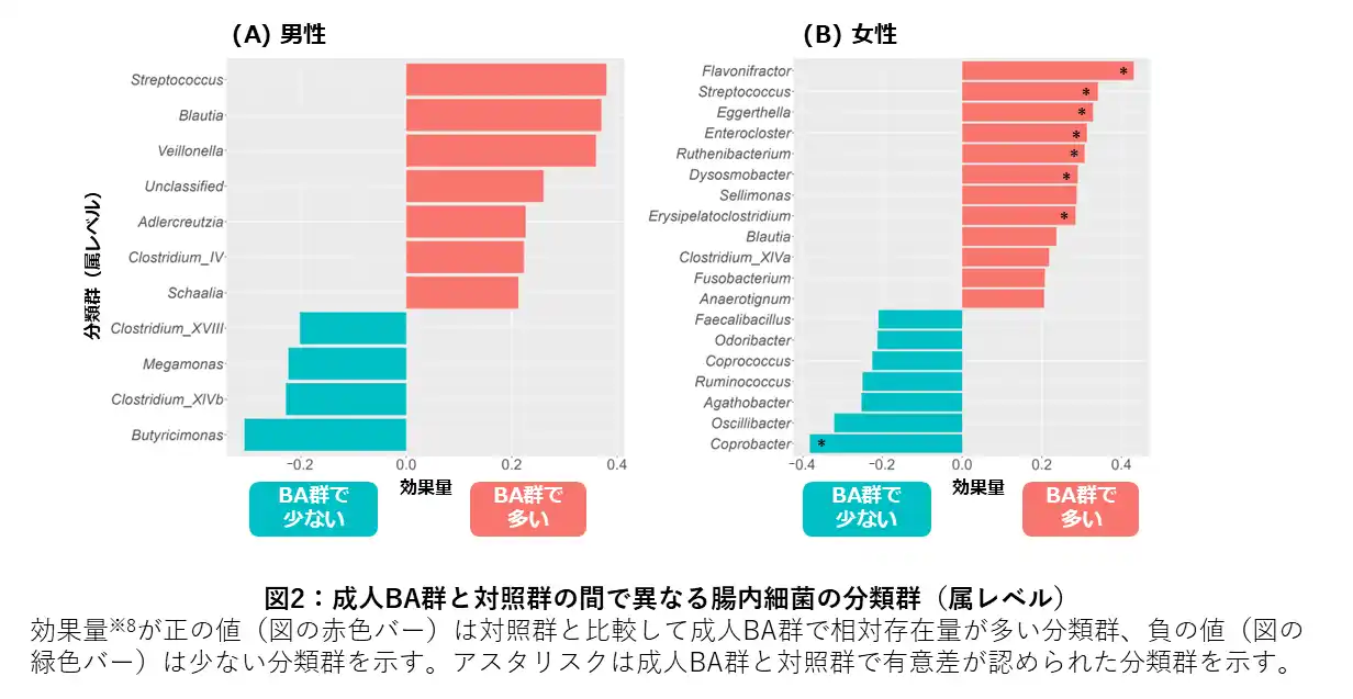 成人BA群と対照群で異なる腸内細菌の分類群(属レベル)を解析したところ、男性の成人BA群では対照群と比較してStreptococcus、Blautia、Veillonella、Unclassified(属レベルの分類が定まらなかった細菌)、Adlercreutzia、Clostridium_IVおよびSchaaliaがより多く、一方で、Butyricimonas、