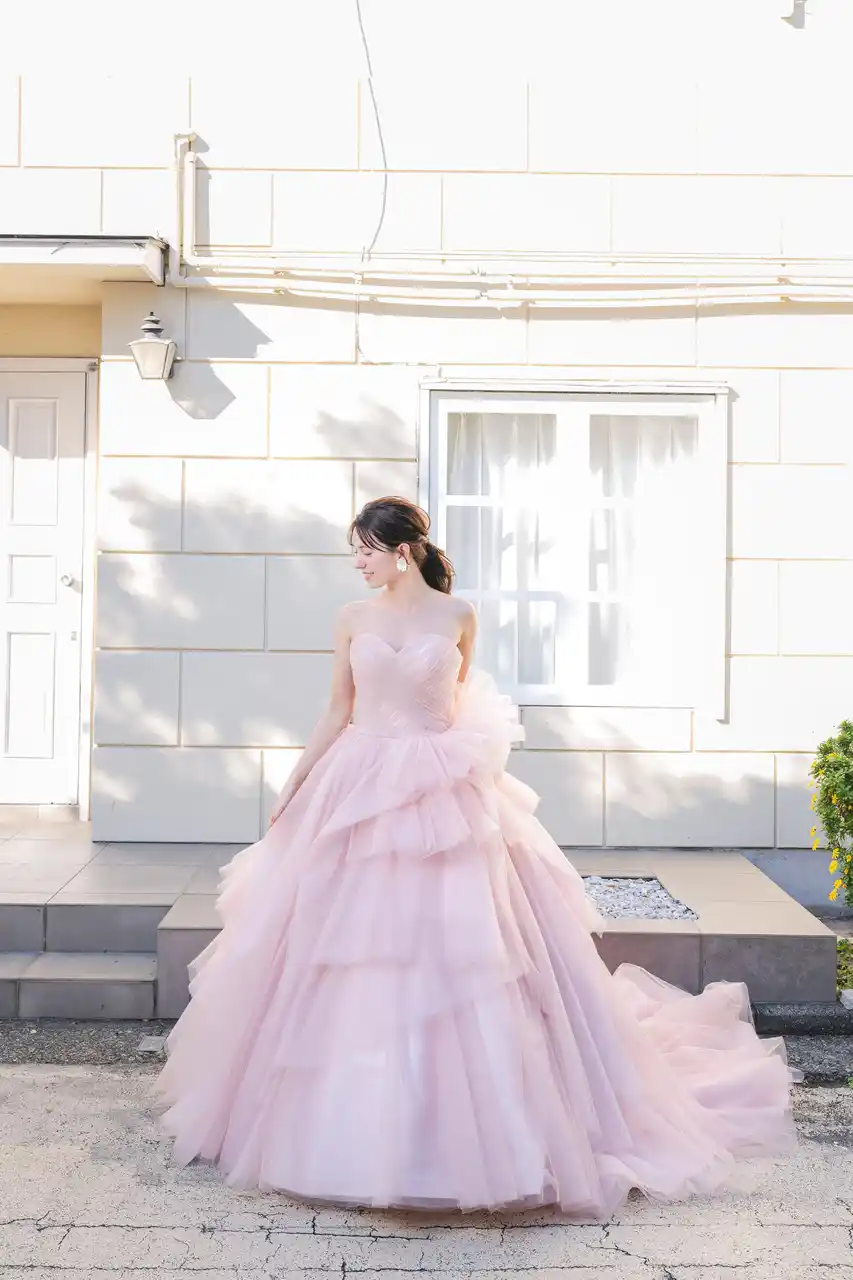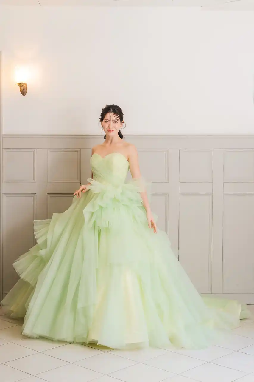 チュールを何層にも重ね、見る角度によって表情が変わるように、細かい部分までとことんこだわったプリンセスラインドレス。パステルカラーのカラードレスも製作し、レパートリー豊かなラインナップに。geni-W20はチュール生地とグリッター生地が重なった華やかな質感、geni-W21はマットな風合いが特徴です。 |