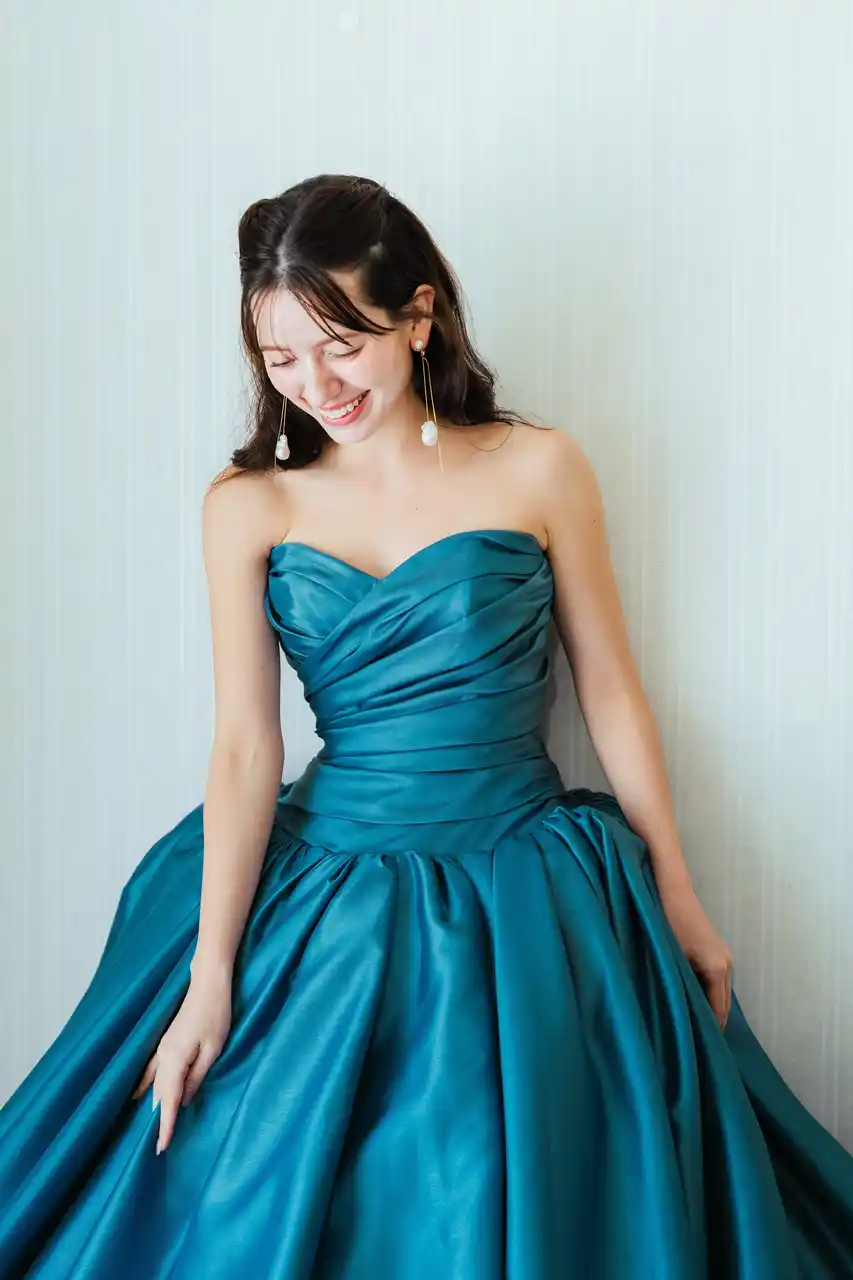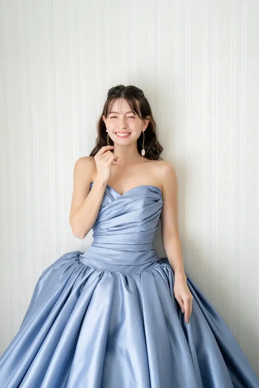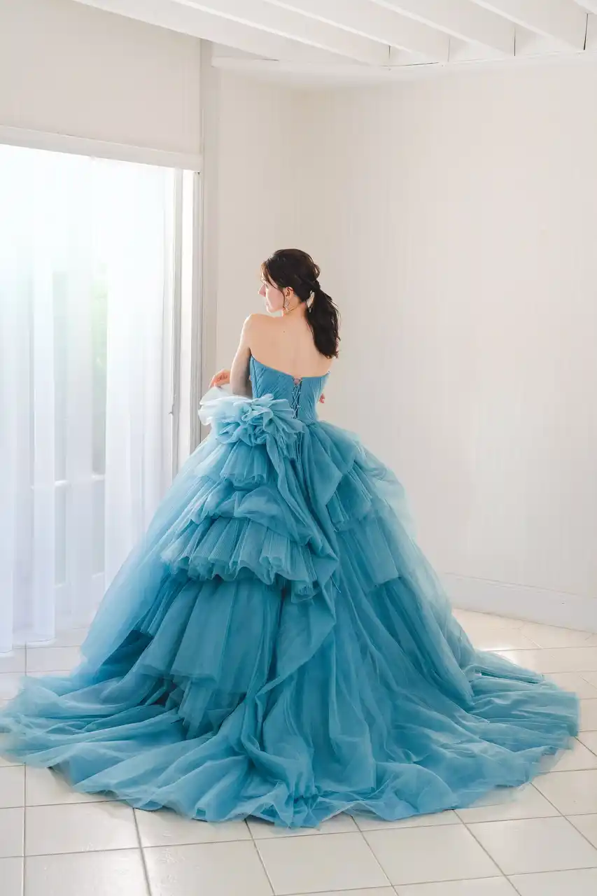 爽やかなブルーのデニム生地でありつつ、カジュアルすぎず、かたすぎないバランスが魅力的。ご挙式はもちろん、前撮りやパーティにもぴったりのスタイルです。 |