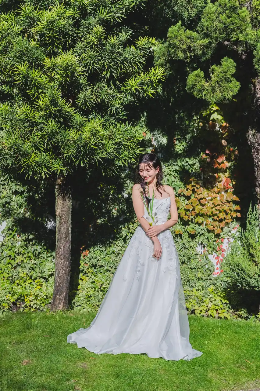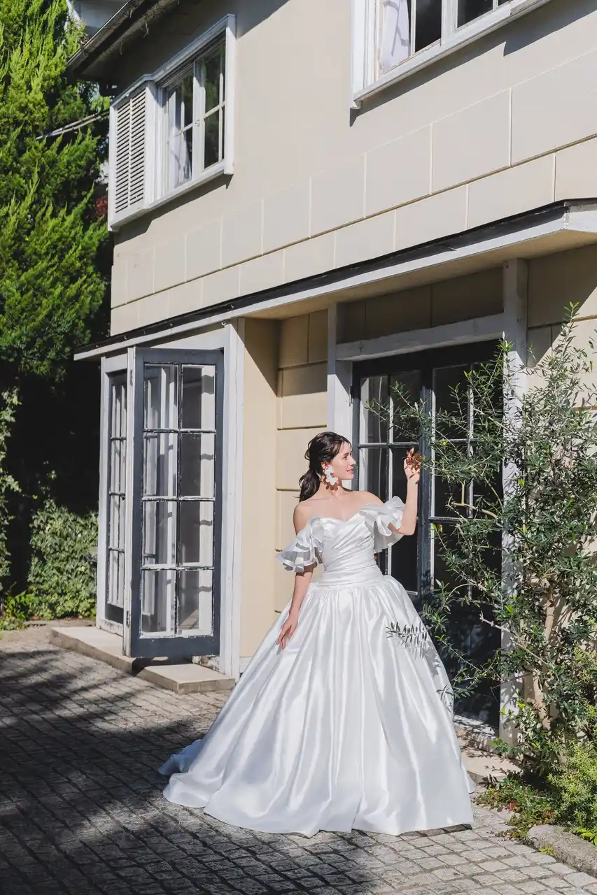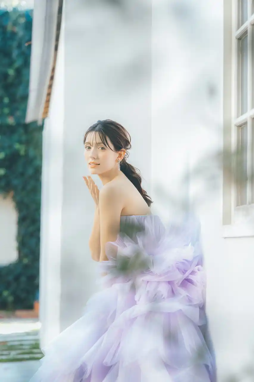 爽やかなブルーのデニム生地でありつつ、カジュアルすぎず、かたすぎないバランスが魅力的。ご挙式はもちろん、前撮りやパーティにもぴったりのスタイルです。 |