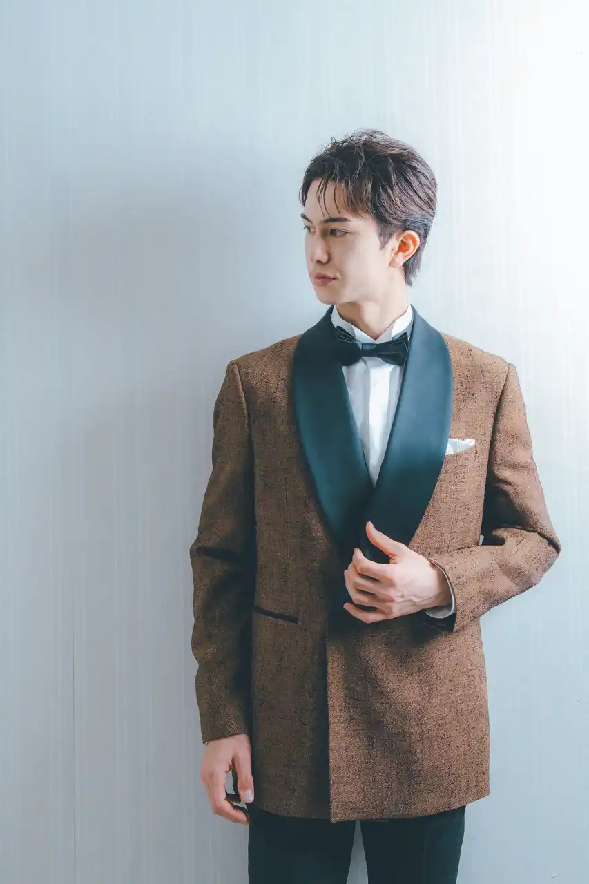 深みのあるブラウンに細かなテクスチャーが施された、落ち着きと個性を兼ね備えたタキシード。大きくカーブを描くブラックのショールカラーが、クラシックな雰囲気を引き立てながらも、全体をシャープにまとめています。 |