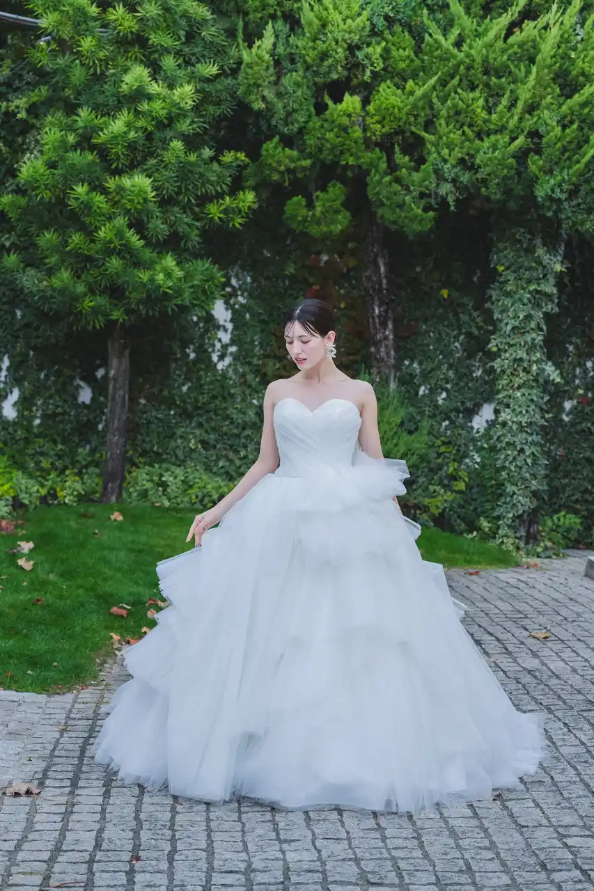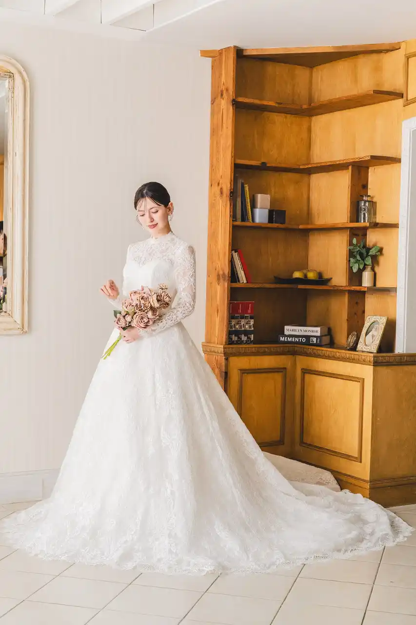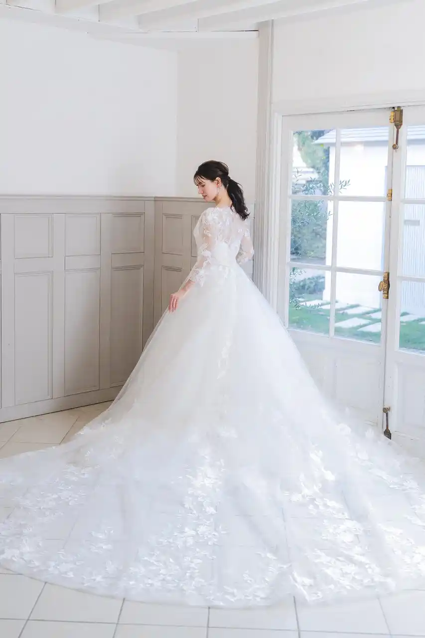繊細なレースと上質な生地が美しく調和したプリンセスラインドレスです。華やかなロングトレーンが存在感を放ち、バックスタイルも美しく見せてくれるフォトジェニックなデザインとなっています。 |