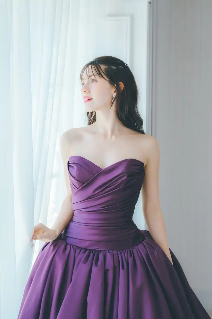 上品な光沢を放つサテン生地で、シンプルなデザインの中に美しさが伝わるドレス。胸元はハートカットで優美なラインを描き、ウエストには細かなタックを寄せることで、程よい立体感と美しいシルエットを実現しました。 |