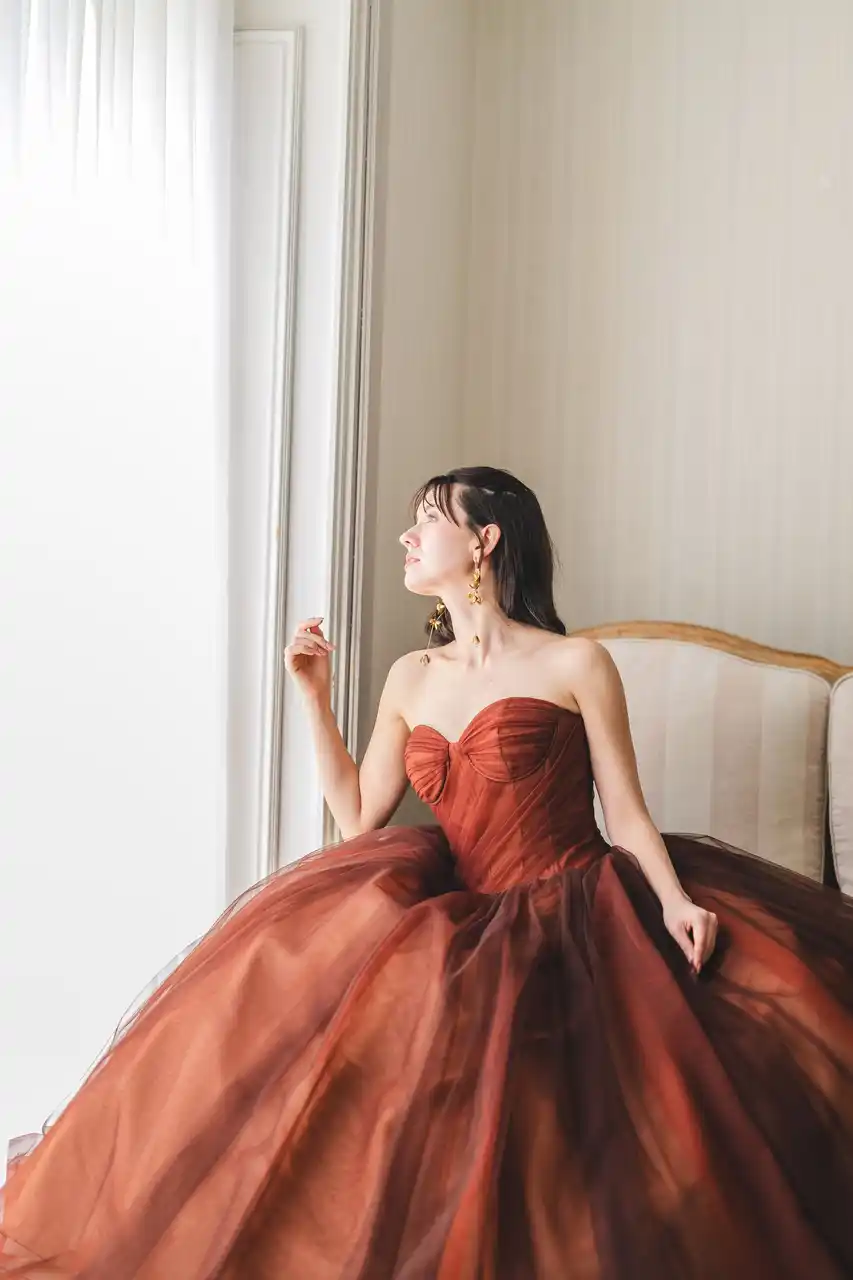 複数の色味を取り入れることによって、より深みのあるオレンジが目を引くドレス。 |