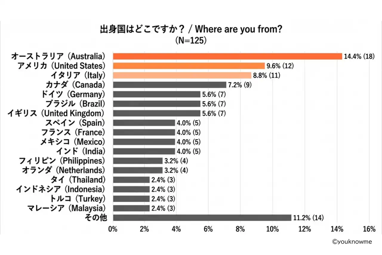 出身国は、オーストラリア(14.4%)が最も多く、アメリカ(9.6%)、イタリア(8.8%)、カナダ(7.2%)等欧米豪、アジア圏までさまざまな国の人が参加しています。 |
