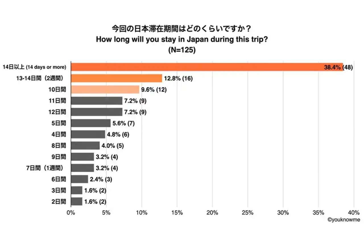 このうち日本に滞在する期間を問う設問では、14日以上(38.4%)、13日~14日(12.8%)という結果となり、年末年始の長期休みは日本滞在がメインであることが分かります。 |