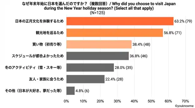 年末年始の長期旅行場所として日本を選んだ理由について聞いてみたところ。「日本の正月文化を体験するため(63.2%)」、「観光地を巡るため(56.8%)」が特に多く、次いで「初売りなどの買い物(38.4%)」、「冬のアクティビティ(28.0%)」となりました。 |