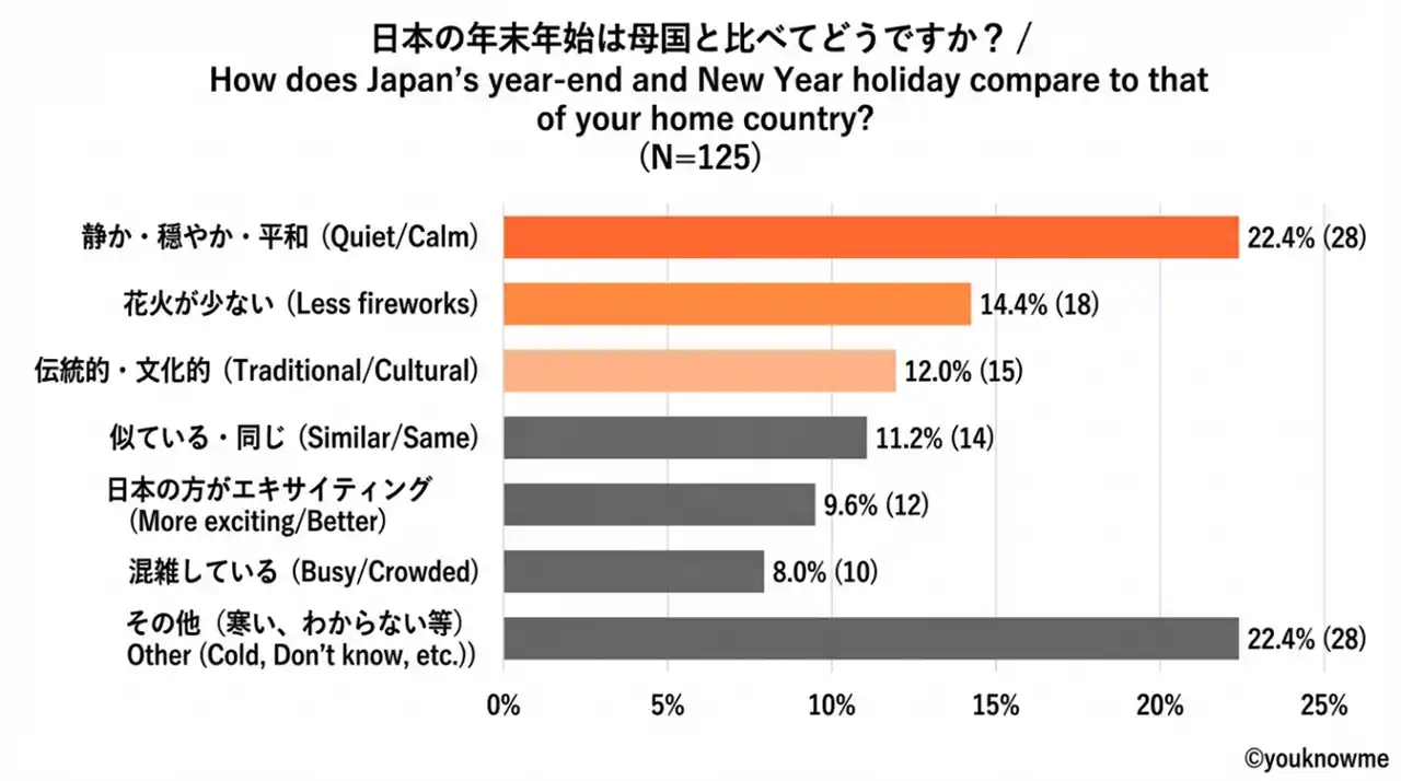 母国と日本の年末年始の雰囲気の違いについて聞いてみたところ(フリーアンサー)、頻出ワードは「静か(Quiet)・穏やか(Calm)・平和(Peacefull)」が最も多く、その他は「花火が少ない」、「伝統的・文化的」というワードが目立ちました。 |