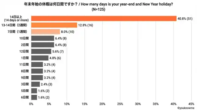 さらに、日本と異なっていたのは彼らの休暇の期間です。回答者125名のうち、14日以上(40.8%)、13日~14日(12.8%)と約2週間休暇の人が半数以上という結果となりました。 |