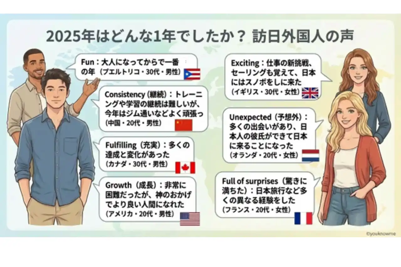 新宿に集まった訪日外国人の皆さんに、「今年の漢字」にちなんで、2025年がどんな年だったかを1単語で表現してもらいました。 |