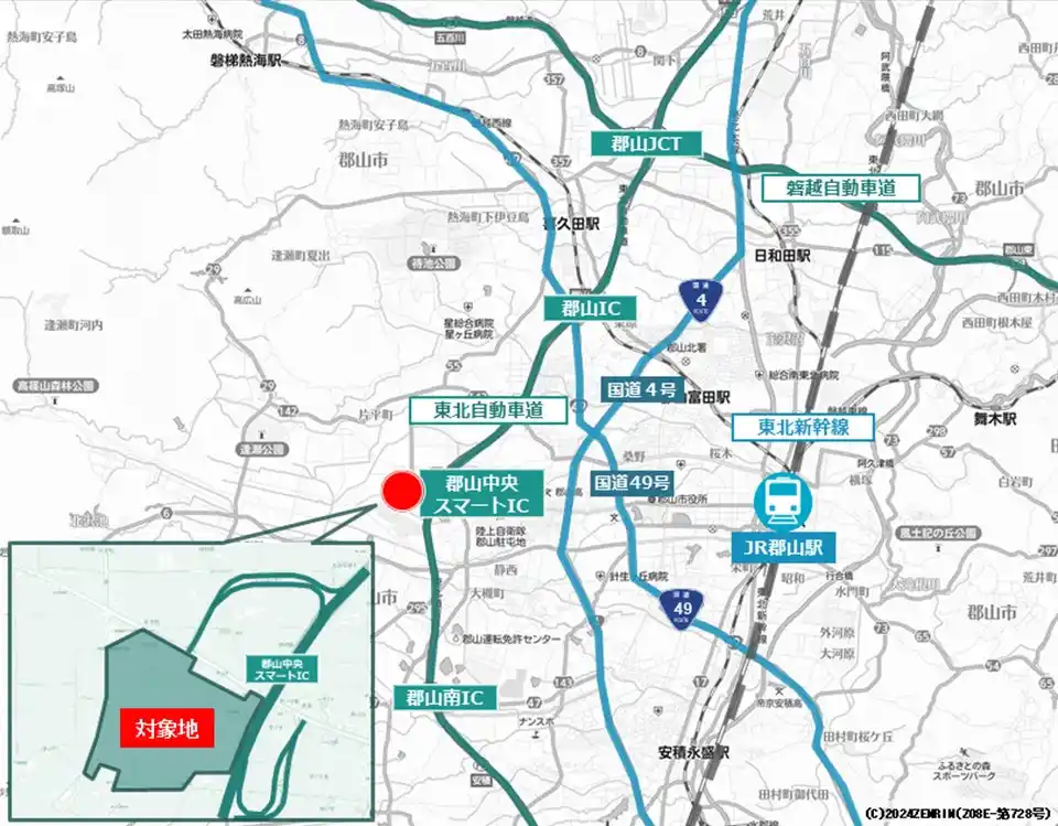 開発地周辺は地盤が強固で、ハザードマップ上においても水害や浸水のリスクが極めて低いエリアです。さらに、災害時には、磐越道など複数の迂回ルートが確保可能であり、東北・首都圏にも災害支援物資を運ぶことができるためBCP(事業継続計画)の観点からも優れた立地といえます。 |