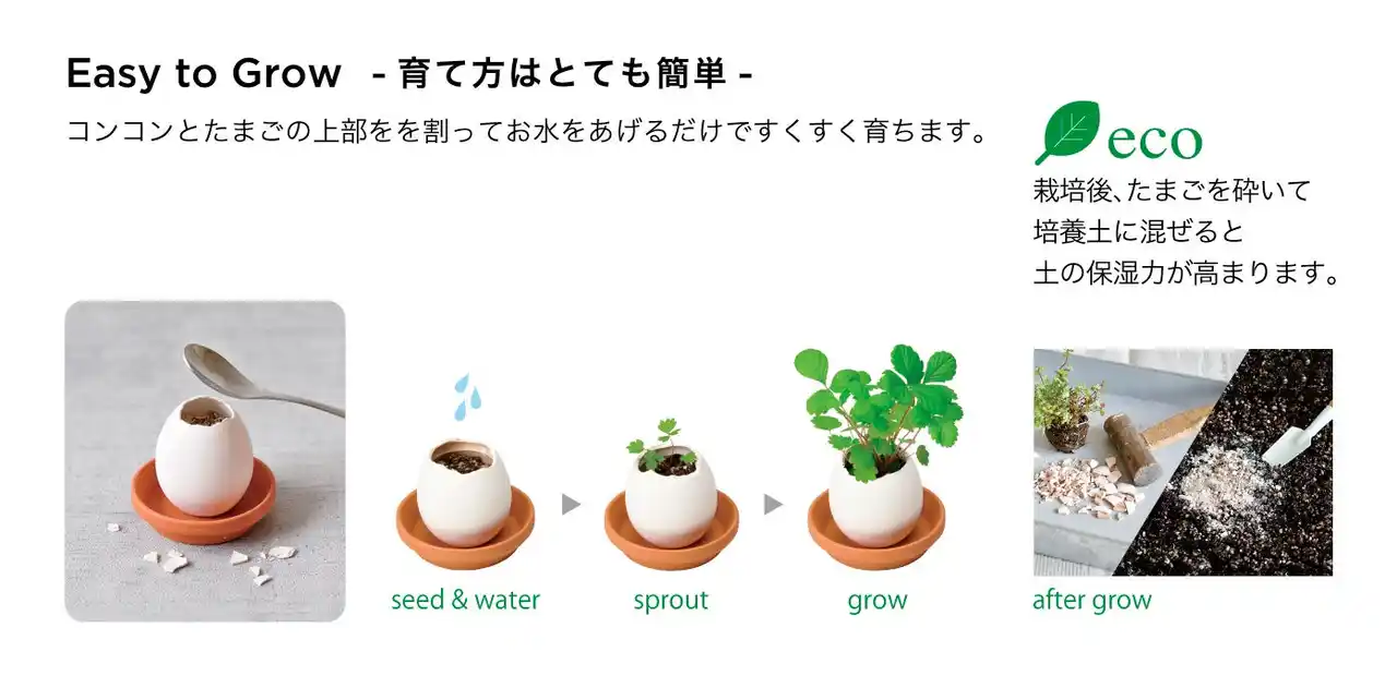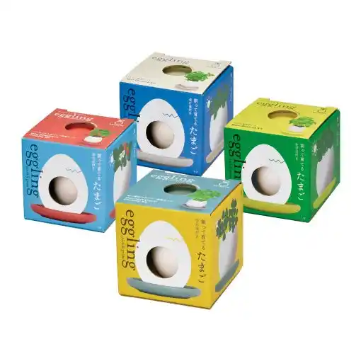 「eggling」は、陶製のたまご型の器の中に、種と土をセットした栽培キットです。たまごの上部をスプーンなどで割って水を与えるだけで植物が育ち、初めての方でも気軽に栽培を楽しめます。 |