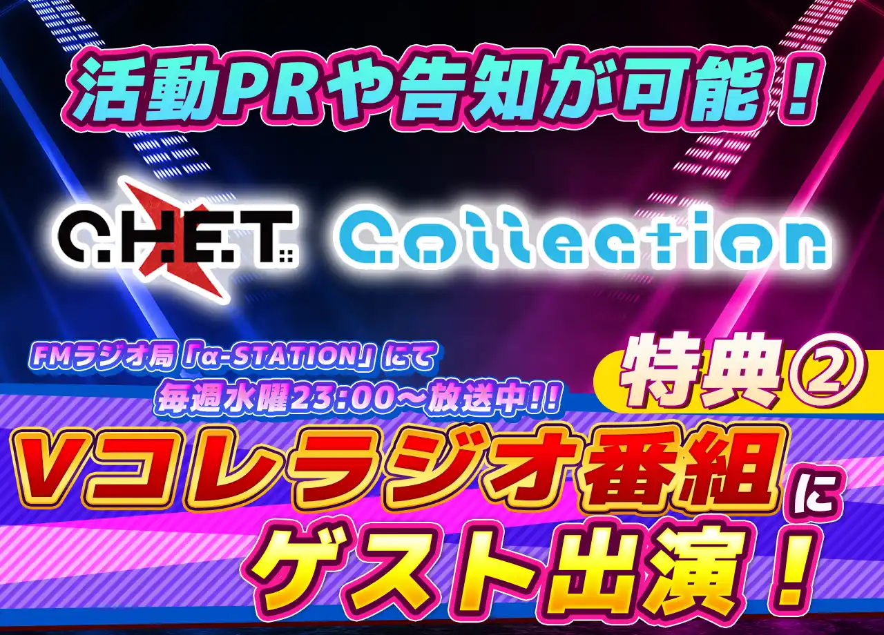 | 様々な媒体で活躍するVTuber、Vライバーにスポットを当てるトーク&音楽のコーナー。また、VCollectionでは様々な企画や音楽など作品が生まれる予定で最新プロジェクト情報もお届けします。 | ||||||